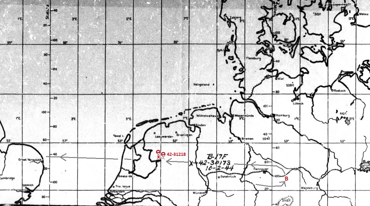 Sgt. Graney: "We were jumped by 10 enemy fighters. Harnish's radio room door stayed closed when we jumped. No one closes the door when bailing out (so he had to be still inside). I wanted to go back to see if he were OK. Burke said to take care of it". Waist gunner Sgt. Lambert: "Two engines out, stabilizers & wings damaged, no 2 engine on fire. Bail out at 20.000 ft (6000m).