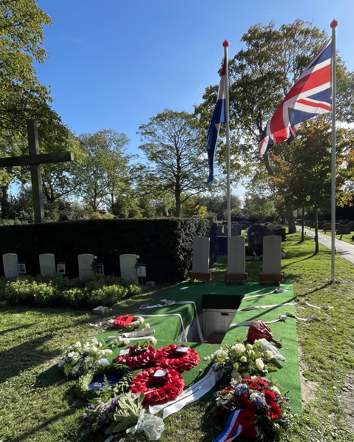 During the trumpet signal, flowers were laid for the crew in Amsterdam, but also in Groesbeek where the four others (P/O Bill Eades, Sgt. James Donald, Sgt. Sidney Deed and Sgt. Arthur Mortimer, RCAF) were interred in 1962 after the second recovery of Lancaster 5512.