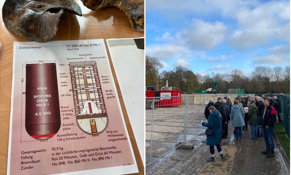 Below. On the table a top plate (shot through by a 20mm round) of a 250 Lbs Target Indicator bomb. This indicates the Lancaster was a Pathfinder on route to Germany and was shot down by a German night fighter. The fact it is a Pathfinder narrows down the list of candidates which one this particular Lancaster could be. Begin 2026 the identifcation shoud be completed. During the open day, hundreds of spectators visited the site. On the left is heavy equipment through which every m3 of excavated soil is filtered. The recovery took three weeks.