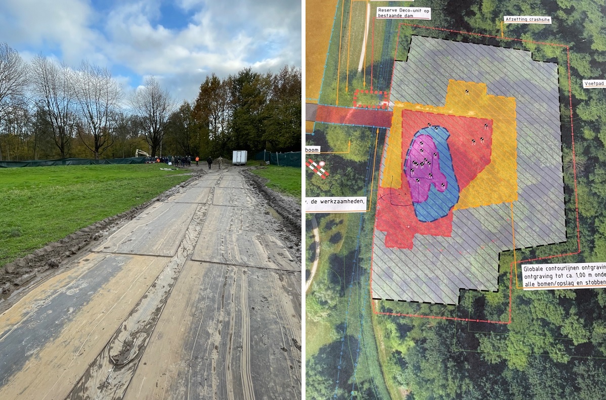 In WW2 this city park in Dronten was water (Lake IJsselmeer / old Zuyder Sea). In 1943 an unknown Lancaster bomber was shot down here by a German night fighter. Water depth at the time was only 4 meters, so the bomber dove into the soft sea bottom. Despite previous recovery attempts by the Germans, fishermen and in 1959 (when also a non-identified crew member was found), the location was forgotten. A final recovery was necessary now and could bring closure.
