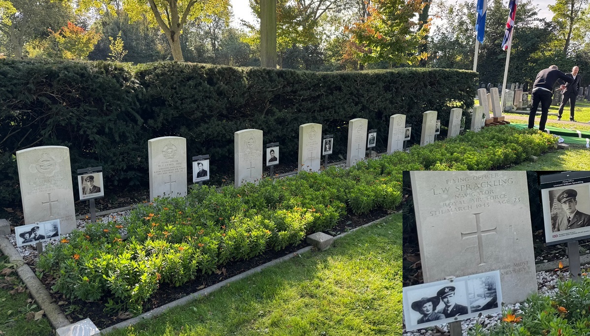 Above. Workum. Another 83-squadron airman rests in grave 1. This is F/O Leonard W. Sprackling. Navigator of the missing Lancaster OL-V (3 MIA). He was the first allied airman buried here after his aircraft was shot down by a German nightfighter on the return from Essen in the night 5/6 March 1943. They came down in the Lake in simular conditions as the ED603 / OL-L on 12/13 June 1943. It very likely that they knew each other, although the rotation at 83 squadron was high: from 5/6 March 1943 (the OL-V) till 12/13 June 1943 (the OL-L), the squadron lost 15 Lancasters in the night-bombing over the Ruhr valley: the OL-V, B, S, X, M, R, H, the new V, C, F, J, the new R, A, G en the OL-L.