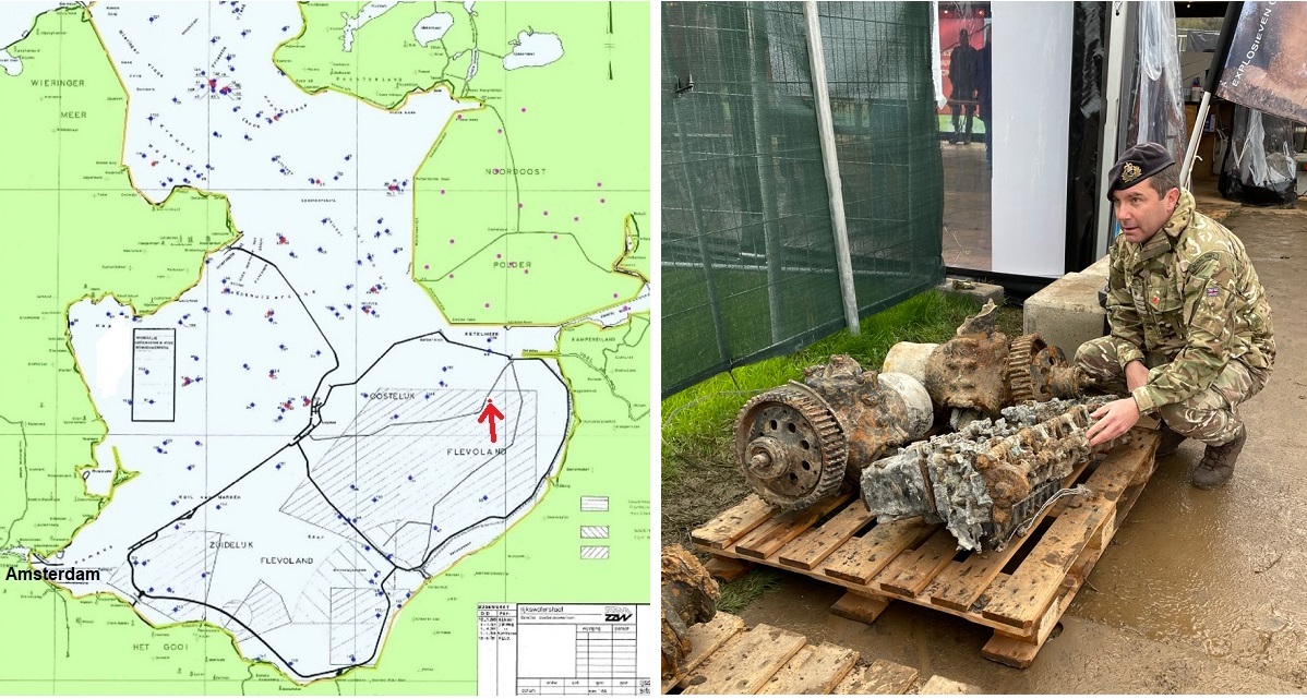 Debris was found over a large area. This was not only caused by the crash, but also by demolition with explosives in 1959. When this area became a polder and was drained, the used method to clear old unexploded ordnance and obstacles in the new land, was to assemble the items in a pit and blow them up (including aircraft structures). Such a pit was found in this recovery, together with bomb- and artillery shell fragments of all kind, because the Germans used this lake area also as artillery range to test captured French and British guns, see this range marked on the light green sea chart further below.